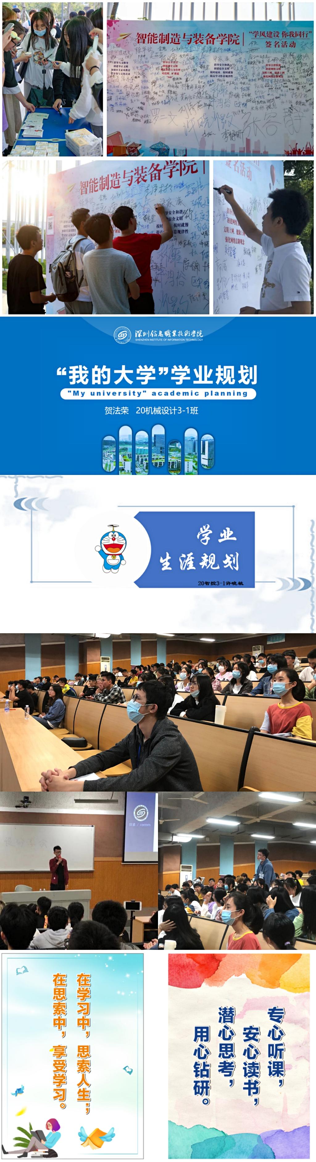 为进一步促使广大同学明确学习目标,端正学习态度,规范学习行为,养成良好的学习习惯,智能制造与装备学院于11月组织开展了一系列学风建设活动,以实际行动促进优良学风的形成。本次活动由“学风建设,你我同行”签名墙、“我的大学”学业规划设计比赛、“榜样面对面”分享会、“养成好习惯”学风宣传四项分活动组成。
