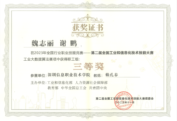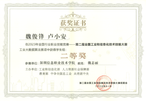 1、2023年全国行业职业技能竞赛一第二届全国工业和信息化技术技能大赛工业大数据算法赛项中获得学生组二等奖;