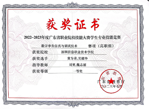 9、2022-2023年度广东省职业院校技能大赛学生专业技能竞赛数字孪生仿真与调试技术赛项(高职组)一等奖。