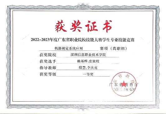 8、2022-2023年度广东省职业院校技能大赛学生专业技能竞赛机器视觉系统应用赛项(高职组)一等奖;